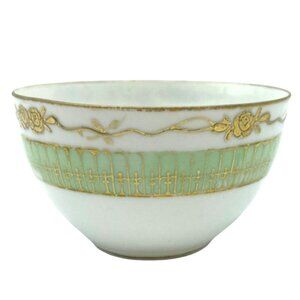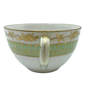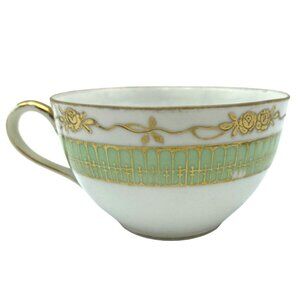 This elegant antique Nippon tea cup and saucer set showcases the finesse of hand-painted craftsmanship with luxurious gold trim. The intricate floral pattern and harmonious colors exemplify early 20th-century Japanese artistry, making it a distinguished piece for collectors or a tasteful choice for serving tea.
