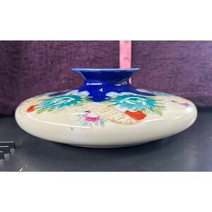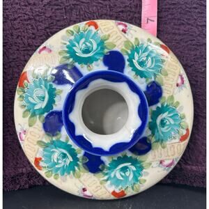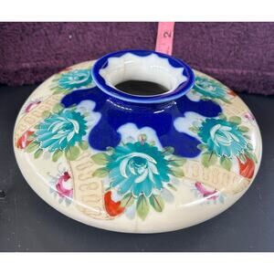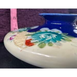 Features a round, flattened shape with a central opening, adorned with intricate hand-painted prominent teal flowers and a contrasting deep blue glaze, along with gold accents. It is unmarked, but verified as early Nippon. The term "Nippon" refers to porcelain made in Japan and exported, primarily to the United States, between 1891 and 1921.