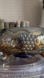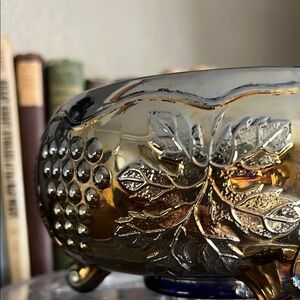 This rare colored Northwood Grape and Cable Leaf bowl is 6-1/2” in diameter standing on three feet as shown. There are three bunches of grapes and leaves on the side. The N is on the outside and is barely visible. No doubt it is a beautiful centerpiece bowl in the rare Nutmeg coloring with cobalt blue on the inside. It exhibits in an elegant gold and silver featuring a detailed raised embossed leaf and grape design. Perfect for adding a touch of sophistication to any space. Please view the video as well as all photos as this gives the best description of the piece accurately. There are no flaws noted, there may be some mold marks from the straw in making the piece. Thank you for stopping by! Check out my other carnival glass pieces.