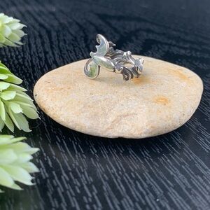 This rare ring was handcrafted from an antique seafood fork! Often called a spoon ring. It kind of looks like a trident! It is sterling silver and hallmarked “STERLING”. Likely dating to the Victorian era due to its pattern. Has a floral swirl pattern and can be worn with any side showing. It is approximately a US size 7.