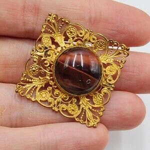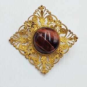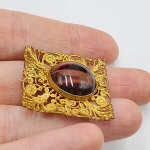 Antique Optic Purple Tigers Eye Glass and Gold Tone C Clasp Filigree Pin Brooch