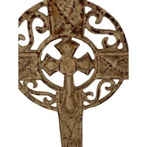 This cast iron Celtic cross features intricate detailing and a robust design suitable for indoor or outdoor display. Its timeless, antique style adds a touch of historical charm to any setting, serving as a striking centerpiece or accent piece. Ideal for those appreciating traditional craftsmanship.