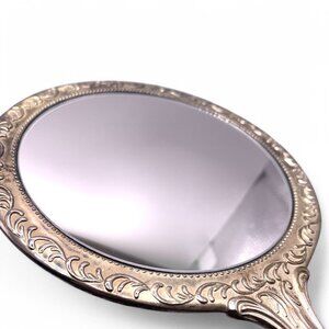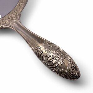 Antique Ornate Silver Handheld Vanity Mirror With Floral Engraving Etched Handle
