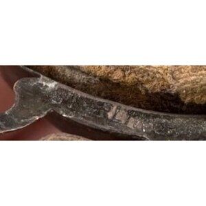 Fabric backing is worn and frayed; metal stand shows signs of wear and patina. Approx. 2.5" tall, 2." wide.