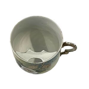 Antique porcelain mustache cup with a detailed floral and pinecone design in green, white, and gold. Features a built-in mustache guard and an ornate gilded handle. Excellent vintage condition. Some gold has worn from the handle & mustache lip.