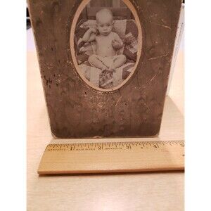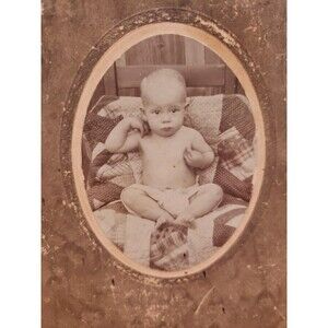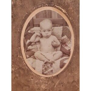 This antique photograph cabinet card from the 1880s features a portrait of a baby wearing a diaper on a quilt, with hands near the head. The 4 x 6 inch card is made of cardboard and paper, with a glossy sepia image that captures the tender moment in a unique and one-of-a-kind style typical of photojournalism. This original photograph, produced in the United States during the late 19th century, offers a glimpse into the past with its charming subject and historical significance. Pre-owned, well used, worn card. See photos for condition and wear. Oval photo mounted on card. Edges and corners of card are significantly worn. Hand writing on the back. Great Bundle Item!