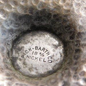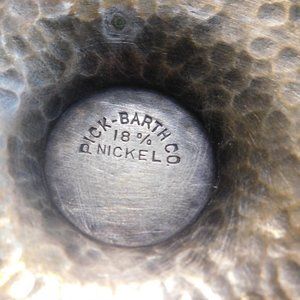 Silver in color, hammered metal look, each one has the manufacturer name and the 18% Nickel stamped on the bottom