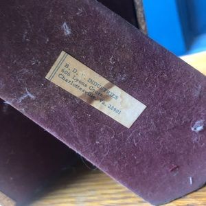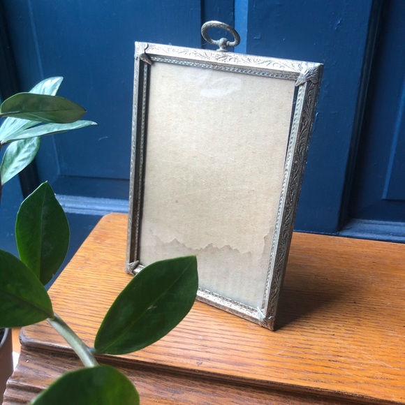 Simple silver frame with circular top detail (also helps to hang it). Felt back that slides in to back of frame and has a stand that works as well.