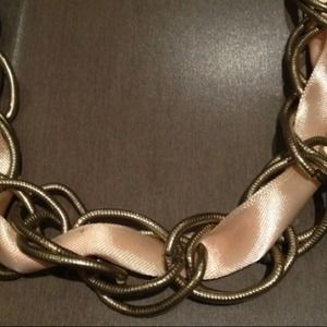 Antique gold chain necklace with pink ribbon. Tie closure. Adjustable length 17-34".