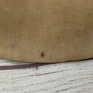 Antique porcelain oval bowl or serving dish. This bowl is a cloudy creamy beige color with a metallic gold feather-like chain link that circles the interior and a set of pink and white roses with green leaves on one side. There is some crazing and spots of wear to the glaze. There are a few black speckle spots and raised glaze spots on the bottom. It is an old bowl with some discoloration and wear but no major cracks or chips.