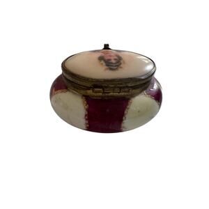 This exquisite antique porcelain trinket jar features a detailed hand-painted portrait of a Victorian-era woman on the lid, surrounded by a delicate blush and burgundy enamel body with gold accents. The hinged lid and metal clasp closure give it both function and charm, perfect for storing rings, keepsakes, or small treasures.