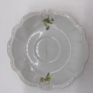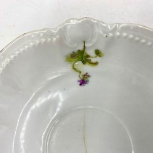 This cup and saucer both have some cracks in the glazing ONLY (porcelain is intact), crazing. There are some manufacturers defects on the saucer bottom, and a chip on the underside of the saucer. There is also some gold loss, as expected in 125 year old porcelain. All can be seen in photos, and price is adjusted for cosmetic condition.
