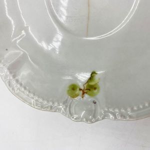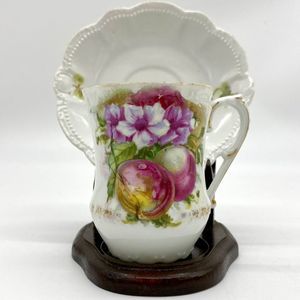 Made between 1895-1910, this beautiful demitasse tea cup and saucer features fruits and florals, and was manufactured at Porzellanfabrik Moschendorf (Moschendorf Porcelain Factory), Bavaria.