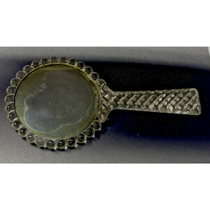 There are some rough areas and small chips along the seams. The mirror appears stained and may require additional cleaning. On the end of the handle it reads Pat Apl'd For. The backside is swirled and looks like 3-D. The beading along the mirror almost looks like candlewick. Please review the pictures closely. The item measures approx 7.25 x 3.75 inches.