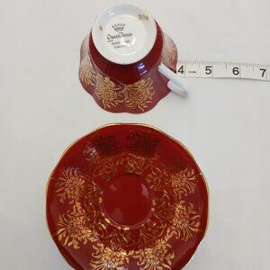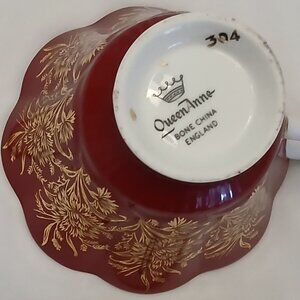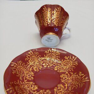 Antique Queen Anne bone china made in England. Red tea cup and saucer with gold design on exterior of tea cup and saucer.