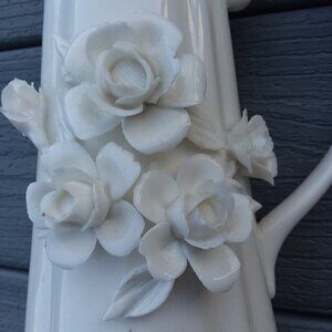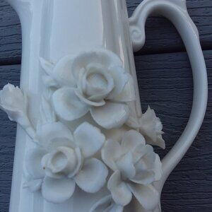 Antique Reflections bone china pitcher with raised floral design. Height is approximately 7 1/2 inches, base is about 4 inches.