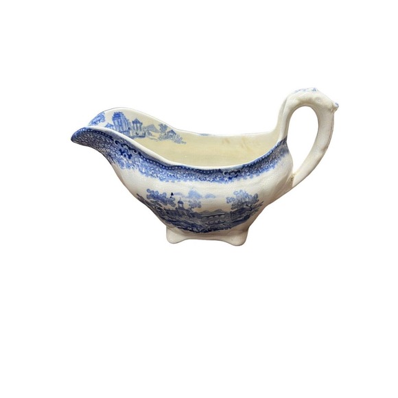 Antique Ridgeways Blue White Scenic Gravy Boat England