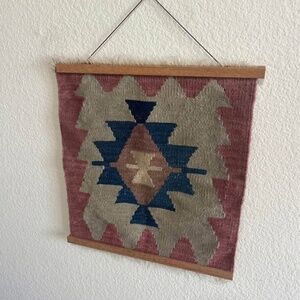 Beautiful, earthy rose, blue, and neutral Kilim Rug handwoven wall hanging. The colors are very current. This would be beautiful, beautiful as part of a gallery wall, or on its own in a smaller space. Or, could be Upcycled into a denim jacket :).
