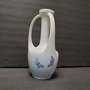 Lovely antique, art nouveau Royal Copenhagen 3-handle vase. Beautifully adorned with butterflies on one side and Morning Glory vine and flowers on the other side. Each vase is uniquely hand painted, and the markings on the underneath indicate this vase is dated around the turn of the century (between 1889 and 1922).