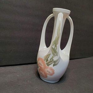 Royal Copenhagen is a famous Danish porcelain maker. Their pieces are highly sought after. This 3-handle vase in this design is very rare, and these vases command quite a premium among Royal Copenhagen antique porcelain collectors.
