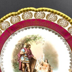 Add a touch of old-world European charm to your collection with this stunning antique porcelain plate made by Royal O&EG Austria (Oscar & Edgar Gutherz), dating from the late 19th to early 20th century (circa 1890–1918). This beautiful display plate measures approximately 9 3/4 inches in diameter and features an intricate mythological scene at the center — a noble warrior or hero standing by a stream with bathing nymphs — surrounded by a rich pink and deep gold floral border with ornate gilded detailing and a gently scalloped edge. Made of glossy porcelain, the plate measures 9.75 inches in diameter and is a perfect addition to any collector's display, suitable for all occasions and with a touch of German culture. A true vintage piece that exudes elegance and history.This piece is in very good antique condition with no chips, cracks, or repairs noted. Light wear to the gilding consistent with age — please see photos for full details as they are part of the description.