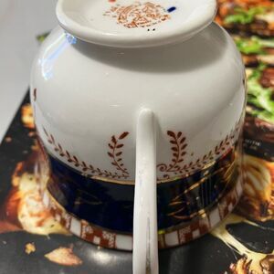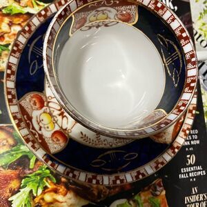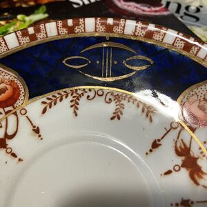 The pattern includes cobalt blue, rust transfer, and gilt accents.