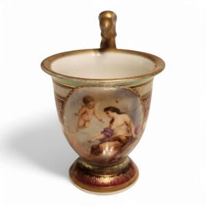 Keywords: Antique Royal Vienna, demitasse cup, cherub angel cup, gold gilt porcelain, European porcelain, vintage espresso cup, collectible teacup, fine china, hand-painted porcelain, gilded tea cup, Royal Vienna Austria, Rococo style, Victorian tea set, neoclassical porcelain, burgundy and green porcelain, ornate antique cup, decorative porcelain, heirloom china, luxury vintage tableware, elegant home decor