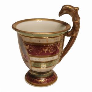 This antique Royal Vienna demitasse cup is a stunning collectible featuring a cherub angel motif, rich burgundy and green hues, and intricate gold gilt detailing. Crafted with the elegance and artistry Royal Vienna is known for, this exquisite cup is perfect for collectors or those who appreciate fine European porcelain.
