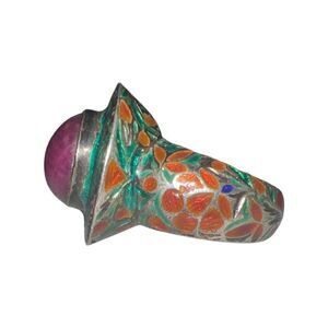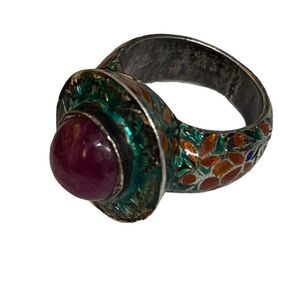 This ring is beyond magnificent in fact I’m not sure why I’m even selling it. It’s so beautiful and nothing like I’ve ever seen. With green and red poured glass in the design of a floral pattern with a couple blue petals in the mix and the main big stone a reddish pink berry ruby. Approximately size 7-8
