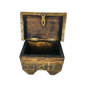 Antique Rustic Old World Hammered Tooled Brass Copper Wood Trinket Box Chest
