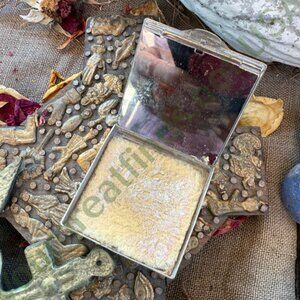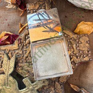Measures 1 5/8" square. Still has original puffs and blush. The lever button that opens and releases the interior section works great.