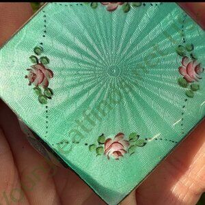 Antique silver square compact. It is decorated with white enamel on all outer surfaces and the lid is a beautiful aqua green guilloche enamel with hand painted roses.