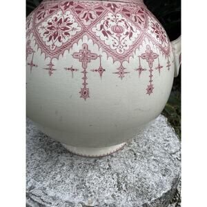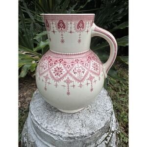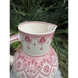 This is a gorgeous antique French faience pitcher by Utzschneider & Cie, made in Sarreguemines, France, in the highly collectible Calcutta pattern. Featuring intricate red (pink) transferware with an ornate floral and geometric motif, this large pitcher dates to the late 19th to early 20th century.