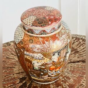Beautiful antique piece. From Japan. Covered small ginger style jar. Enamel and gold hand decorate it design. Wonderful detailing. Great display piece.