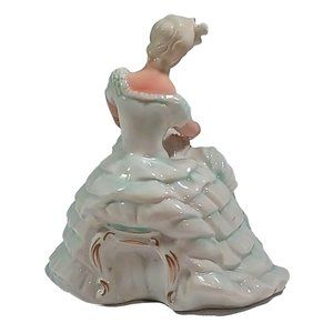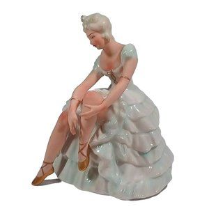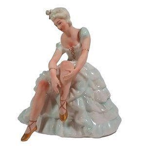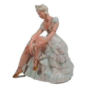 This gorgeous antique Art Nouveau style porcelain figurine from Schaubach Kunst Wallendorf is a beautiful representation of a ballerina putting on her golden ballet slippers, getting ready for a performance,