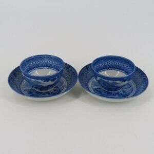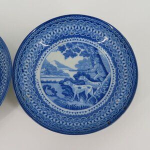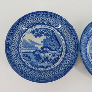 Antique Set of 2 Saucers Cups Blue White Staffordshire Hunting Men Dogs Country