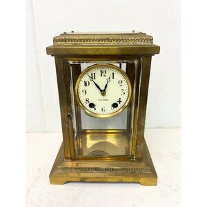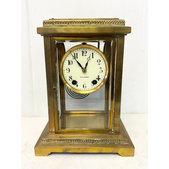 Beveled glass. Door in front and door in back. Beautiful metal design. Marked Seth Thomas. 10.5 inches tall 8 inches wide depth is 6.25 inches. 12 LBS.Selling "as is." Not sure if it is in working condition.