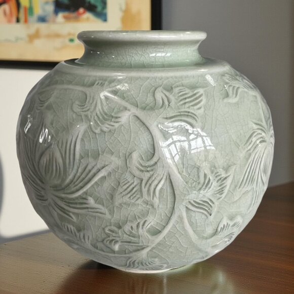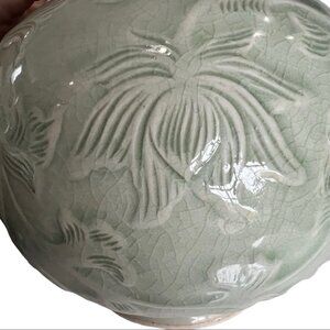 Listing is for a Signed and Marked Celadon Crackle Vase from South East Asia, dating possibly from the mid 20th Century. The glazed vase is in great vintage condition with no cracks or chips and measures 5" in height and roughly 6" in diameter at its widest point. Vase features a lotus and leaf motif.