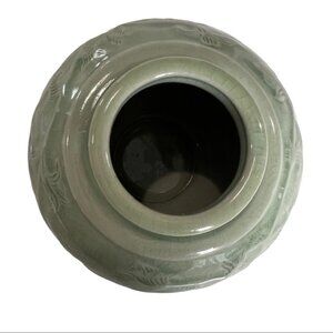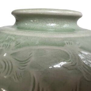Antique Signed & # Chinese Celadon Porcelain Vase Lotus and Leaf Motif Design 5"