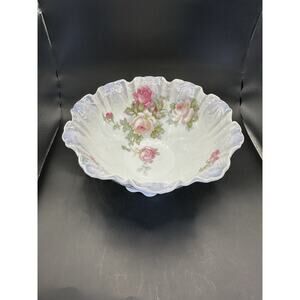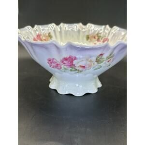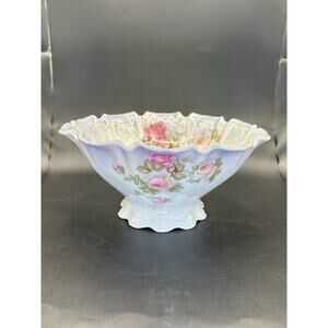 Beautiful fruit/compote bowl that was made at the turn of the 20th century. It was made in Silesia, which is marked on the bottom. It was part of Bavaria at the time, but is now part of Poland. It is a footed bowl that measures 9" wide and 4.5" tall. It has hand painted, multi colored roses and a lusterware glaze. The edges are scalloped. It weighs 1.8 lbs and is in excellent condition with no chips or damage.