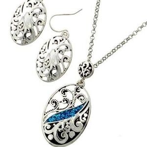 Antique silver tone filigree with blue glitter epoxy necklace and earring set