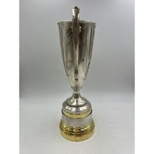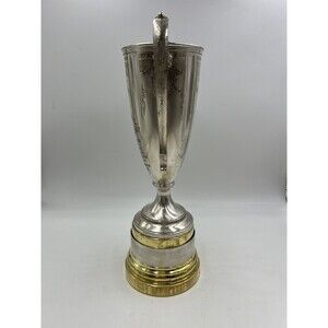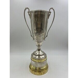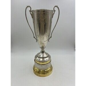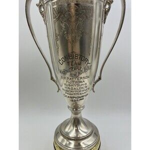 Antique sliver Masonic Temple Consistory Team Bowling League Trophy for the 1925-1926 season. Producers by the Meriden B. Co. International S. Co. The brass bottom screws on and the bottom silver ring is removable. There are signs of wear with some tarnishing and two dings (one on the removable base and one on the trophy under the 26). The trophy stands just under 19" tall to the top of the handles, 8 1/2" across from the outside of one handle to the other, the base is 6 1/2" in diameter, and the top is 5 1/2" in diameter.