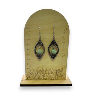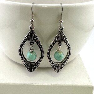 HANDCRAFTED -- These stunning earrings feature a handcrafted filigree design in antique silver pewter, highlighted by a striking Peruvian turquoise gemstone at the center. The elegant teardrop shape and intricate detailing make them a perfect accessory for any occasion. Southwestern flair. These are about 2 1/4" tall and made of pewter with surgical steel ear wires. These are double sided, so the back and front are the same. Brand new, never worn. Great condition.