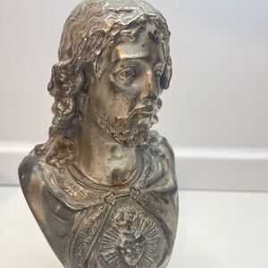 Antique Silver Plate Sacred Heart Statue Of Jesus. Antique, silver plated statue of Jesus Christ with scared heart/bleeding heart medallion at center of chest. Measures 7 inches in height.