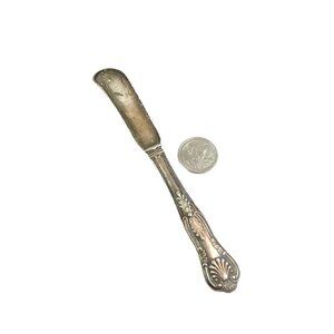 This antique butter knife showcases a beautifully ornate handle design, exuding vintage charm. Made from high-quality silver-plated material, it measures 6.25 inches in length. Ideal for collectors of antique flatware and those who appreciate classic elegance in their table settings.