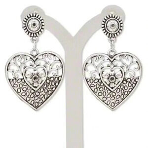 Antique Silver Plated Openwork Filigree Heart Dangle Earrings
