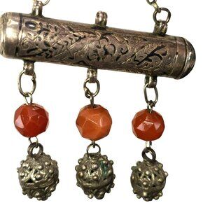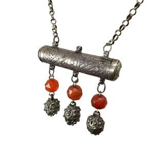 Elegant vintage tribal Yemenite amulet necklace features an intricately engraved silver scroll holder pendant adorned with faceted carnelian color beads and ornate filigree drop charms. The piece combines traditional craftsmanship with timeless design elements, creating a statement accessory with cultural and artistic significance.