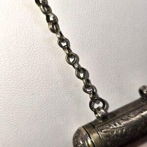 • Detailed engraved cylindrical pendant appears to be silver or plated
