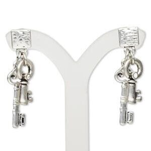 Antique Silver Skeleton Keys Austrian Crystal Square Post Dangle Earrings