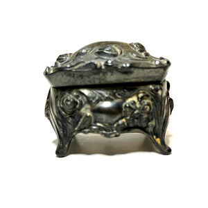 Antique Silver Tone Small Jewelry Trinket Box Casket Hinged Lid Footed Lined